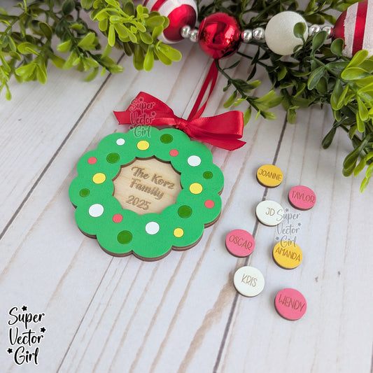 Wreath Family Christmas Ornament, up to 12 Names, SVG, Digital Laser Cut File files, Personalized Name Gifts, Holiday Wood Ornament