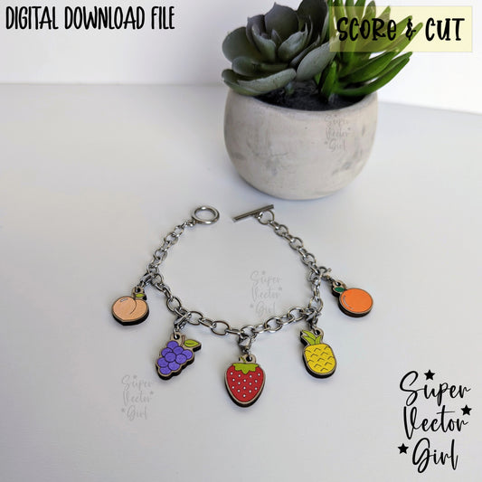Fruits Set 1 Bracelet Charms Bundle Set, SVG, Digital Laser Cut File, xTool Glowforge files, Score & Cut, Summer Fruit Strawberry Grape Peach Orange