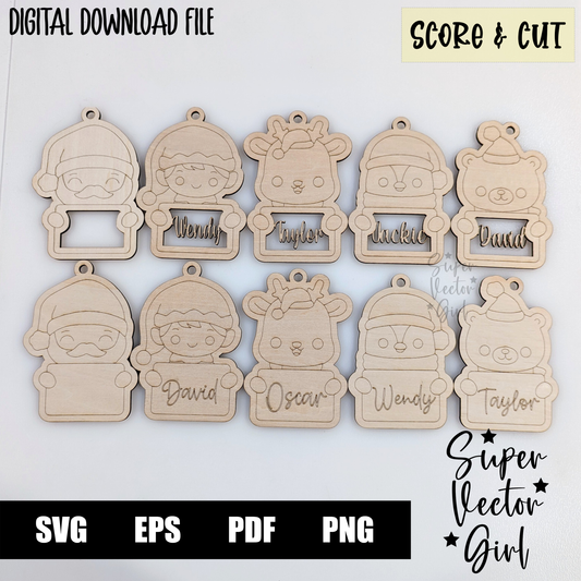 Christmas Gift Tags, Personalized Name Ornament DIY, SVG, Digital Laser Cut File, xTool Glowforge files, Score & Cut, Cute Santa elf reindeer penguin bear Ornaments
