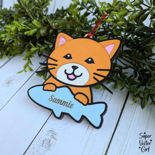 Cat Face Christmas Ornament, Holding Fish, SVG, Digital Laser Cut File files, Personalized Custom Name Tag, Pet, Kitten, Tabby