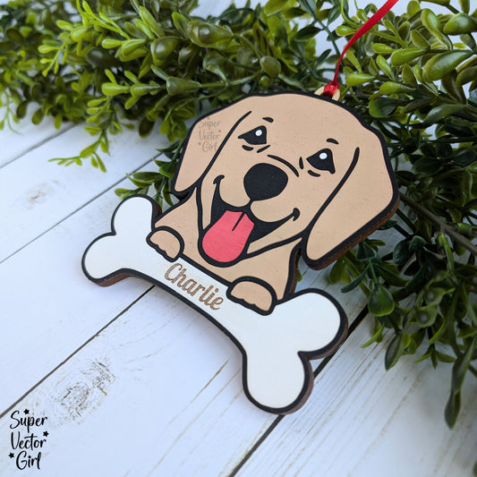 Dog Face Christmas Ornament, Holding Bone, SVG, Digital Laser Cut File files, Personalized Custom Name Tag, Pet, Puppy, Labrador Retriever