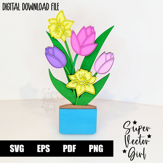 Spring Flower Pot, Laser Cut File, SVG, Mother's Day Flowers, Mom, Tulips Daffodils, Easter, xTool Glowforge files, bouquet decoration centerpiece vase