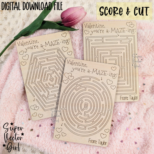 Valentine Maze Card Set SVG Laser Cut File Valentine's Day Score and Cut Wooden Class Valentines Mazes Personalized xTool Glowforge files