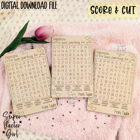 Valentine Word Search Card Set SVG Laser Cut File Valentine's Day Score and Cut Wooden Class Valentines Word Searches xTool Glowforge files