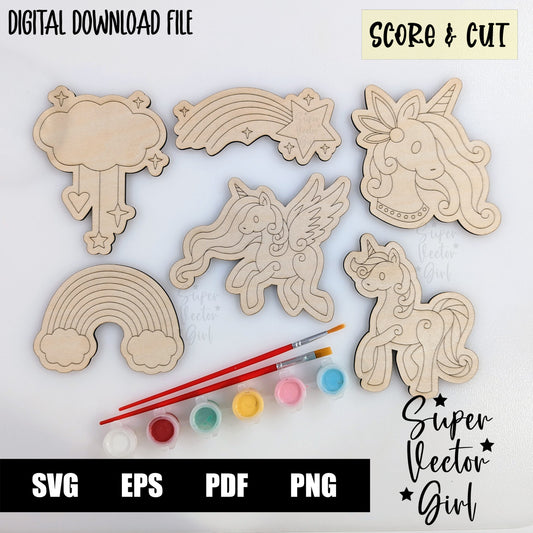 Unicorn and Rainbow DIY Paint Kit Set, SVG, Score & Cut, Laser Cut File, xTool Glowforge files, Cute unicorns shooting star birthday kid coloring