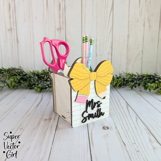 Pencil Bow and Notebook Paper Pen Cup Holder SVG File, Desk Organizer, Personalized Teacher Appreciation Gift, Digital Laser Cut File, Desk Pens Holder, Storage Cup Basket, xTool Glowforge files, Custom Name