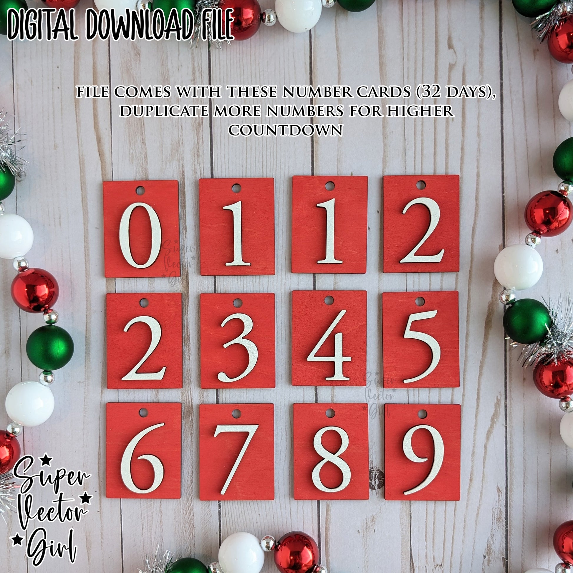 File comes with 12 sets of numbers, allowing you to countdown from 32 days. Duplicate more numbers to countdown from a higher starting number.