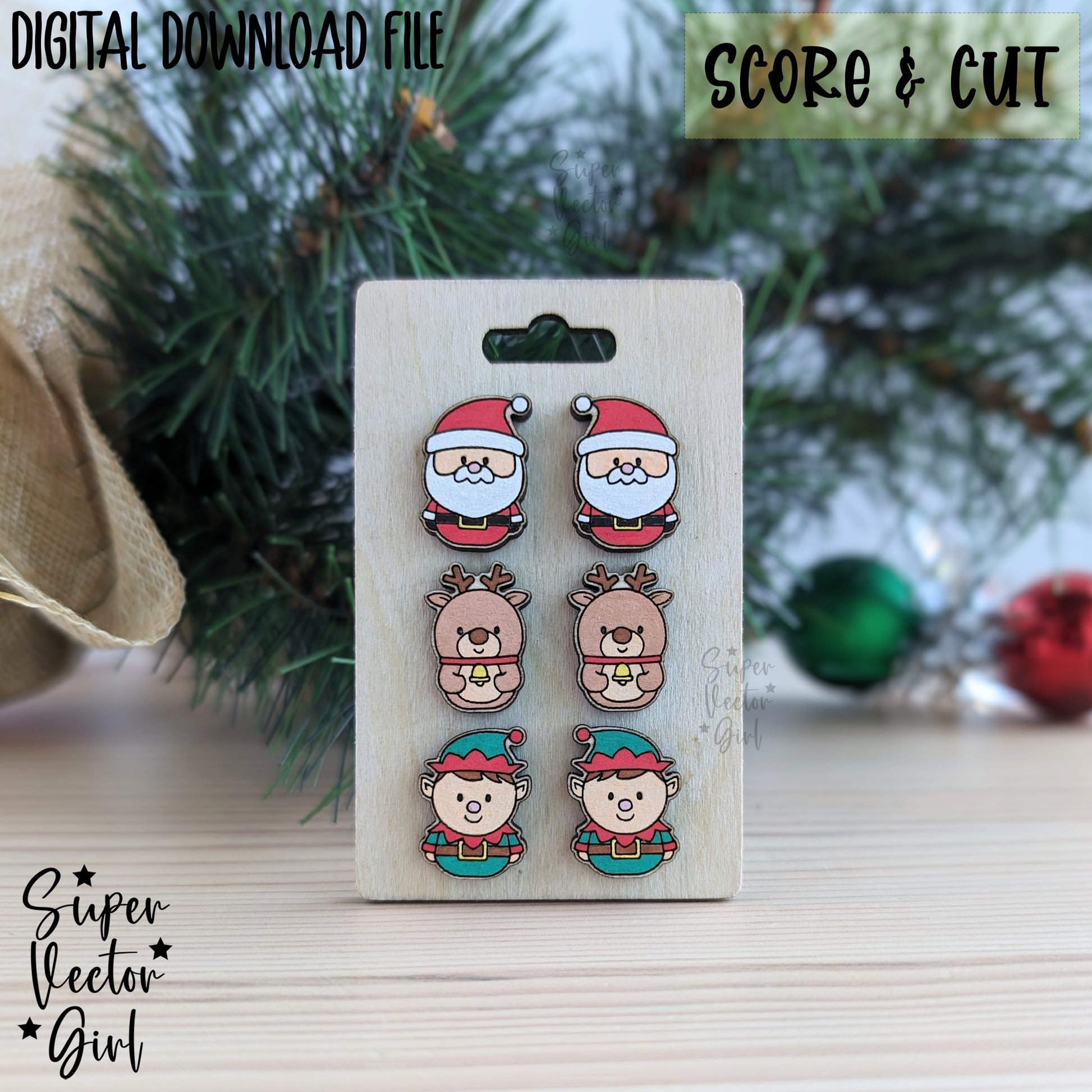 Cute Christmas Stud Earrings Bundle Set, SVG, Digital Laser Cut File files, Score and Cut, Laser Cut Earring, Santa Reindeer Elf Holidays