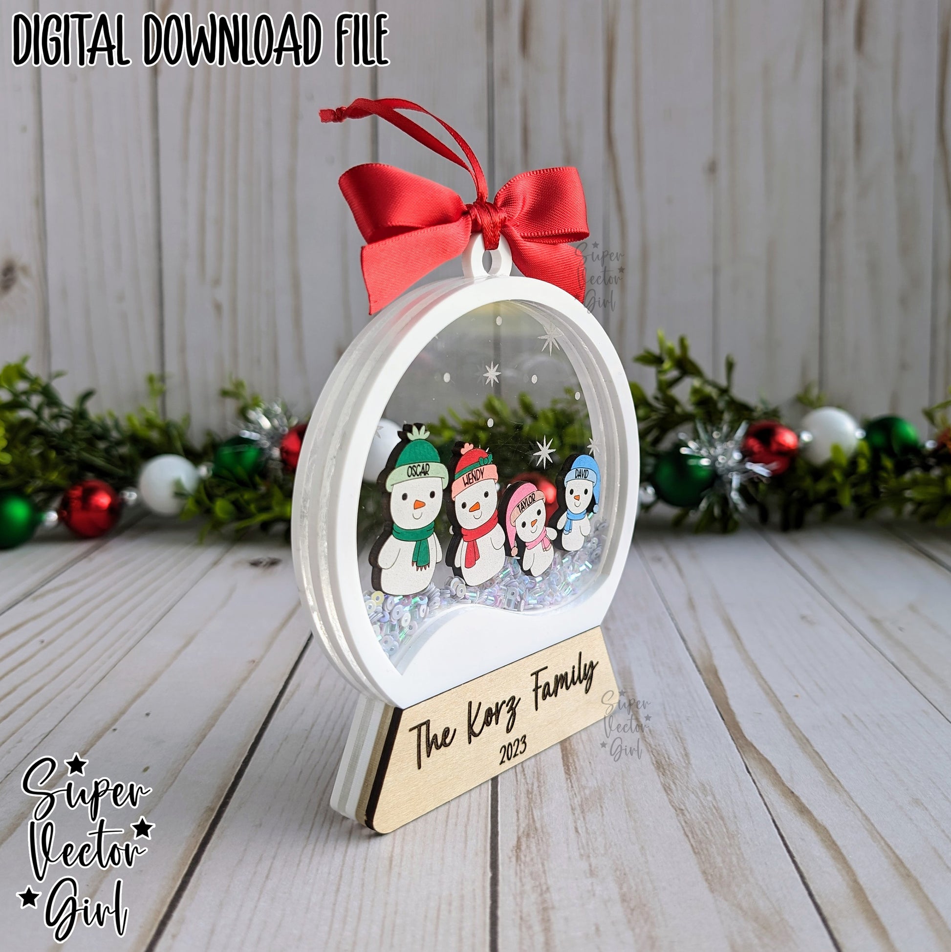 Snow Globe Shaker Snowman Family with Pets, Christmas Ornament up to 10 People, SVG, Laser Cut File, Dog Cat, Personalized Name